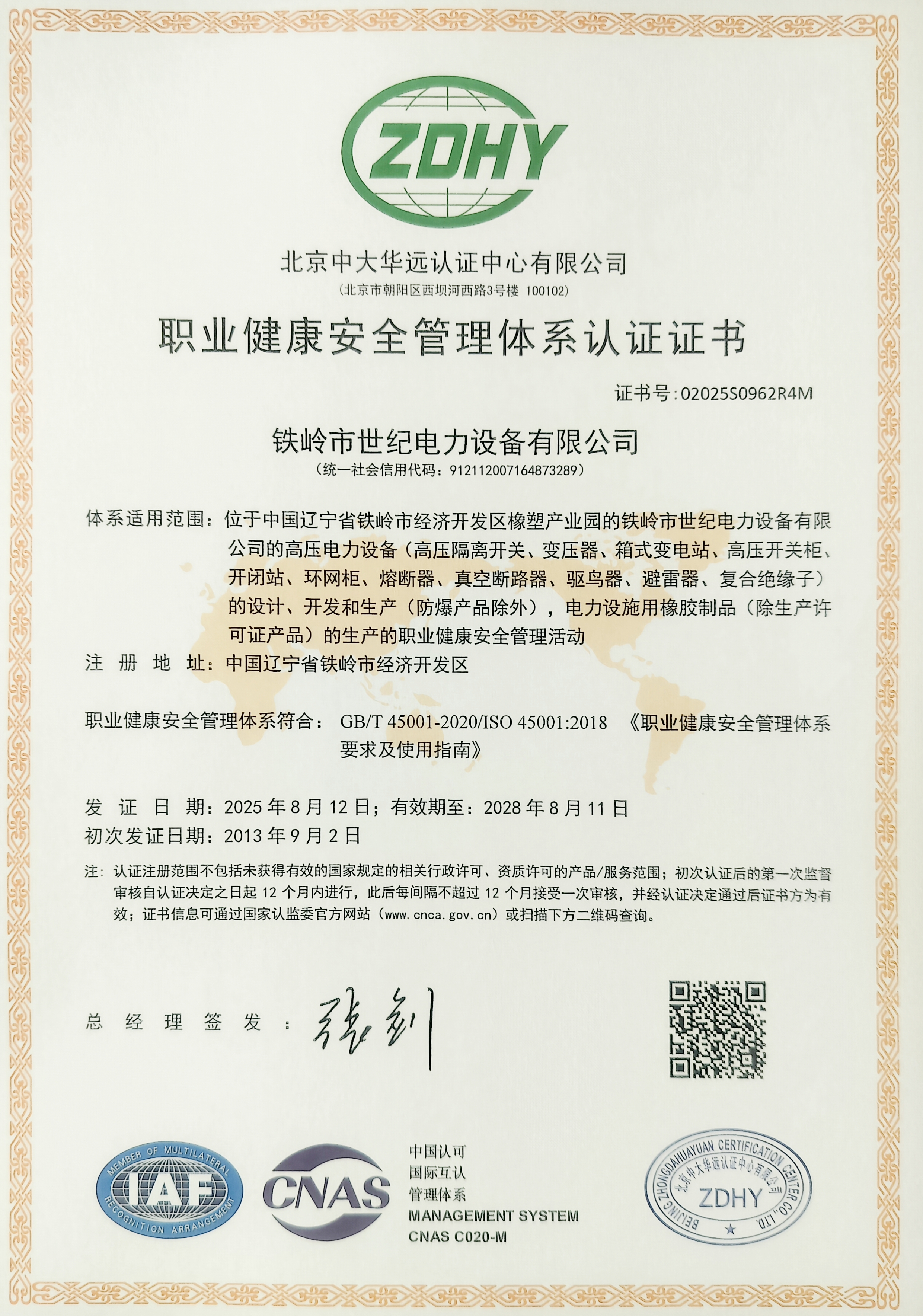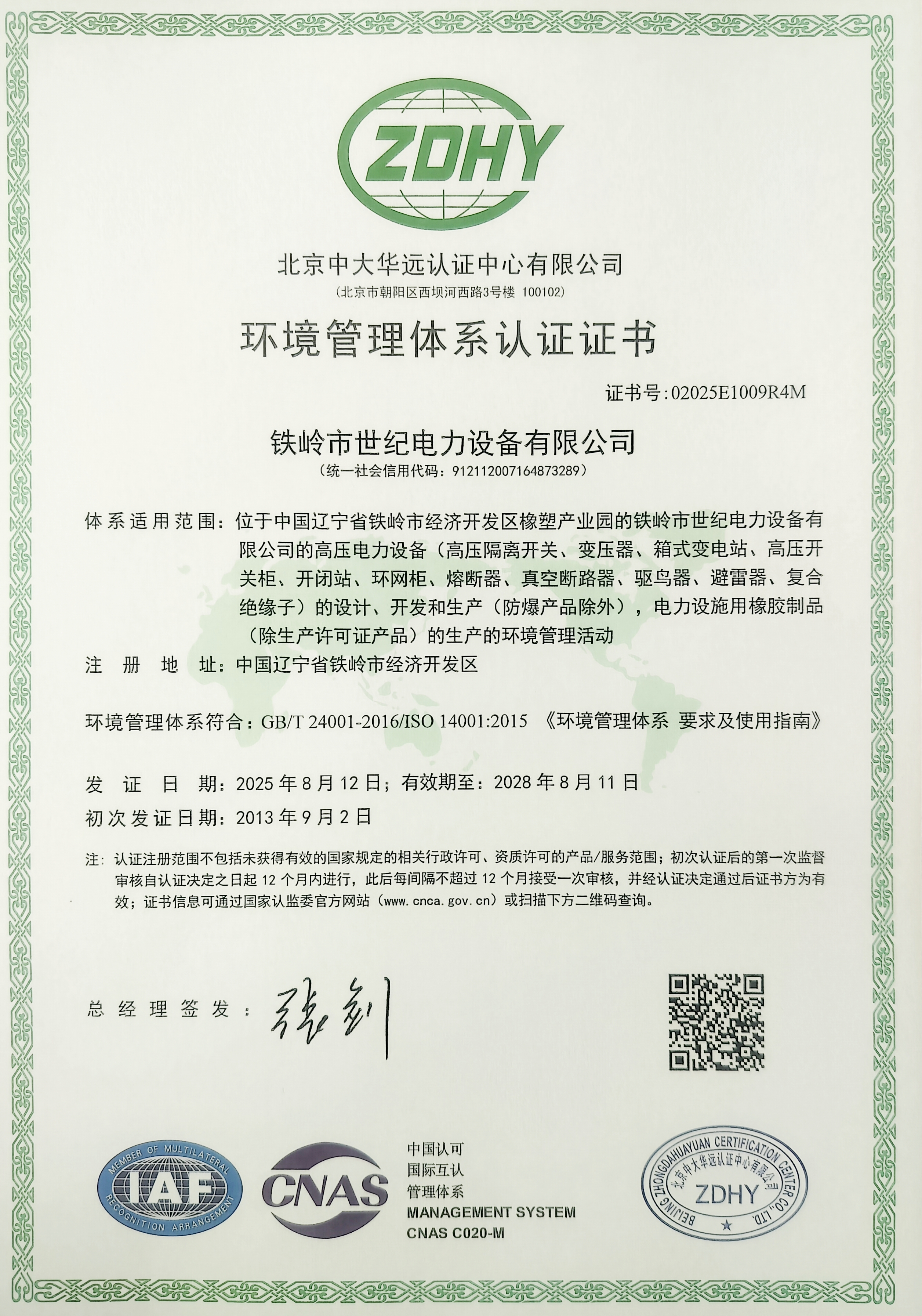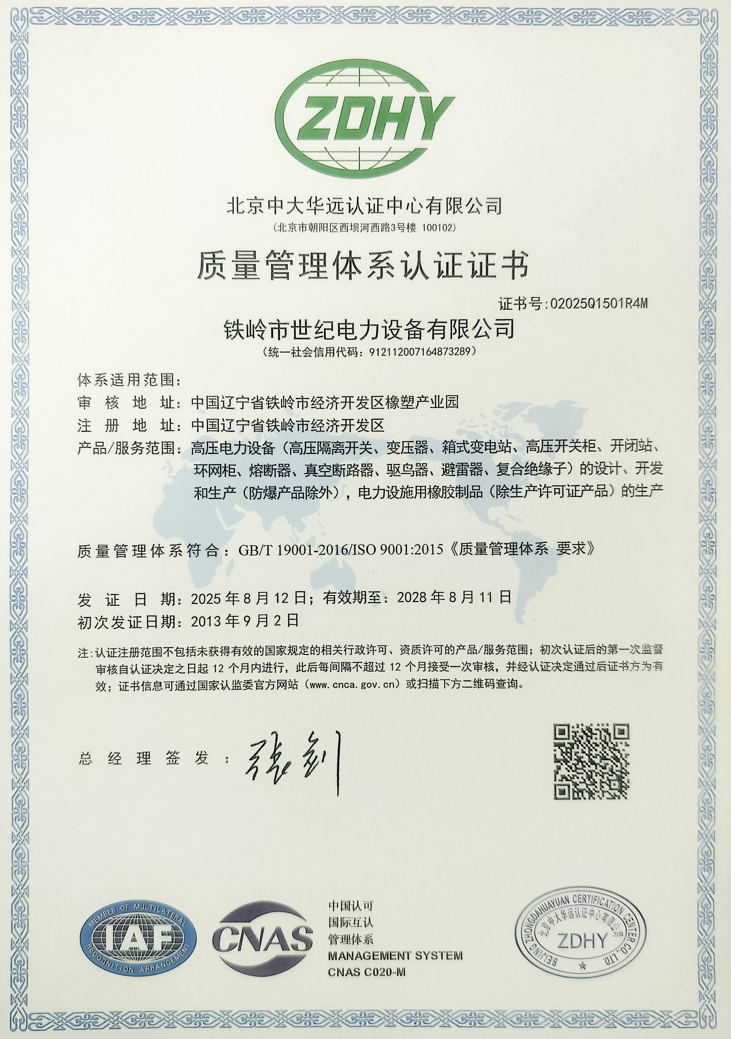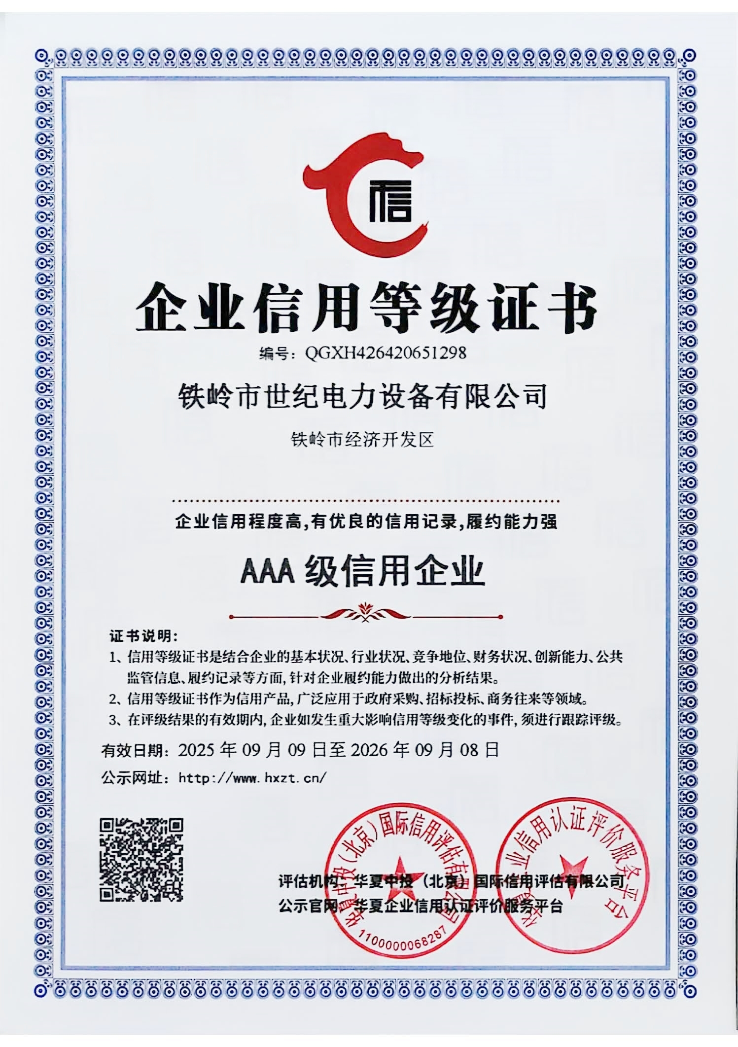 鐵嶺市世紀電力設(shè)備有限公司是集科研開發(fā)、生產(chǎn)制造、用戶服務于一體的國家高新技術(shù)企業(yè),始建于1999年,位于鐵嶺經(jīng)濟開發(fā)區(qū),占地面積5萬余平方米,建筑面積2萬余平方米。主要從事國家電網(wǎng)配套戶外高低壓隔離開關(guān)、電力電纜、變壓器成套裝置、高低壓開關(guān)柜、箱式變電站、絕緣子等產(chǎn)品的研發(fā)、生產(chǎn)和銷售。公司現(xiàn)有國家發(fā)明專利6項、實用新型專利9項,公司通過了ISO9001國際質(zhì)量管理體系認證、ISO14001環(huán)境管理體系認證和ISO 45001職業(yè)健康安全體系認證。